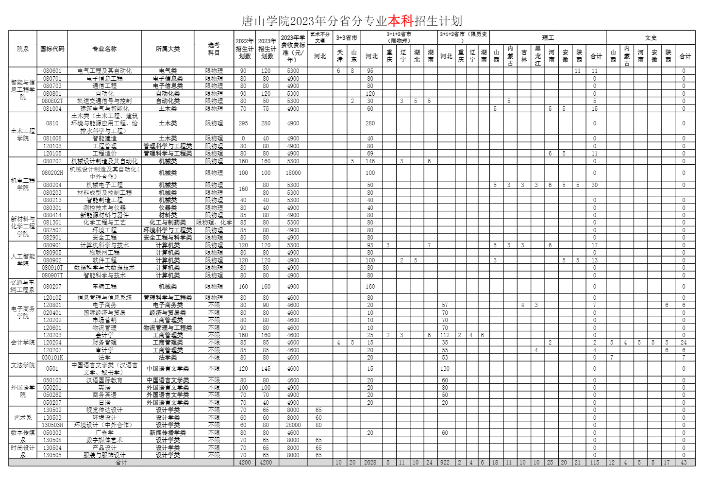 2023年唐山学院各省招生计划及各专业招生人数是多少