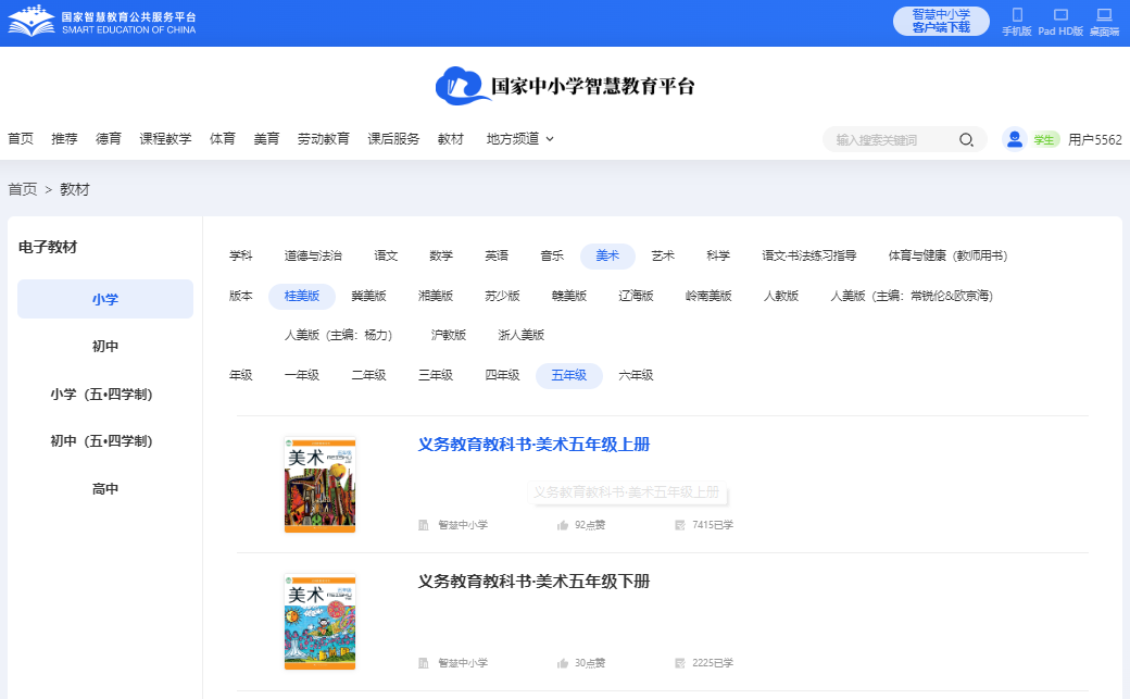 在学习的过程中,有人会用到桂美版五年级上册美术电子课本,为方便大家查找,下面整理了桂美版五年级上册美术电子课本教材,大家只需按照下方步骤操作,即可查看完整、高清版的电子教材,希望对大家有所帮助。![]() 《桂美版五年级上册美术》电子课本 打开国家中小学智慧教育平台网站的教材栏目(网址:https://basic.smartedu.cn/elecEdu),登陆账号,按照下方步骤操作,即可查看桂美版五年级上册美术教材电子版。 具体操作步骤 ▶1、打开:https://basic.smartedu.cn/elecEdu,并登录。 ▶2、左侧导航栏选择“小学” ▶3、学科选择“美术” ▶4、版本选择“桂美版” ▶5、年级选择“五年级”,这时,就会出现对应的课本,点击进去,即可查看。 具体操作如下图所示: ![]() 桂美版五年级上册美术电子课本简介 桂美版五年级上册美术教科书,这套美术教材在展示古今中外优秀美术文化的同时,十分重视传授中华民族传统的美术文化知识,在教材中融入各民族优秀的美术资源,以生动的课堂教学和各式各样的美术作品,营造出浓厚的民族文化氛围。此外,这套教材还强调生活中的美术与审美活动,并注意吸取一线美术教师丰富的教学经验,强调实用性、适用性,充分考虑到在城市、乡村及不同地区不同教学条件下美术教学的实际操作问题。 如何将教材保存到手机上? 点击了解▶电子课本保存到手机上的方法 桂美版五年级上册美术电子课本教材就为大家介绍到这里,想了解桂美版其他年级、学科的电子版教材,请点击电子课本栏目,如果发现不妥之处,请及时指正,感谢大家的理解与支持。 推荐阅读: ➥人教版1-6年级上册数学电子课本教材大全 ➥小学英语教材全套版本 ➥初中数学教材有哪些版本? ➥新教材高中英语电子课本版本介绍 ➥教材是如何装订的? ➥电子课本打印出来不清楚怎么办?? |