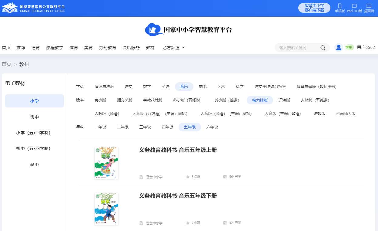 在学习的过程中,有人会用到接力社版五年级上册音乐电子课本,为方便大家查找,下面整理了接力社版五年级上册音乐电子课本教材,大家只需按照下方步骤操作,即可查看完整、高清版的电子教材,希望对大家有所帮助。![]() 《接力社版五年级上册音乐》电子课本 打开国家中小学智慧教育平台网站的教材栏目(网址:https://basic.smartedu.cn/tchMaterial),登陆账号,按照下方步骤操作,即可查看接力社版五年级上册音乐教材电子版。 具体操作步骤 ▶1、打开:https://basic.smartedu.cn/tchMaterial,并登录。 ▶2、左侧导航栏选择“小学” ▶3、学科选择“音乐” ▶4、版本选择“接力社版” ▶5、年级选择“五年级”,这时,就会出现对应的课本,点击进去,即可查看。 具体操作如下图所示: ![]() 接力社版五年级上册音乐电子课本简介 接力社版五年级上册音乐教科书,以审美为中心,以音乐文化为主线,以音乐学科为基点,加强实践与创造,加强综合与渗透,把激发学生学习音乐的兴趣贯穿始终。使学生形成健康的音乐审美观念,以及必要的音乐审美能力。 如何将教材保存到手机上? 点击了解▶电子课本保存到手机上的方法 接力社版五年级上册音乐电子课本教材就为大家介绍到这里,想了解接力社版其他年级、学科的电子版教材,请点击电子课本栏目,如果发现不妥之处,请及时指正,感谢大家的理解与支持。 推荐阅读: ➥人教版1-6年级上册数学电子课本教材大全 ➥小学英语教材全套版本 ➥初中数学教材有哪些版本? ➥新教材高中英语电子课本版本介绍 ➥教材是如何装订的? ➥电子课本打印出来不清楚怎么办?? |