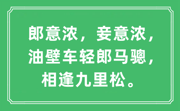 古诗词通过优美的文字与韵律,可以让我们与先贤对话、与历史沟通,下面为大家整理了“郎意浓,妾意浓,油壁车轻郎马骢,相逢九里松”的译文,想了解“郎意浓,妾意浓,油壁车轻郎马骢,相逢九里松”是什么意思、出处及原文翻译,可阅读本文,希望对大家有所帮助。![]() “郎意浓,妾意浓,油壁车轻郎马骢,相逢九里松”是什么意思? “郎意浓,妾意浓,油壁车轻郎马骢,相逢九里松”的意思是:当年郎君与我情意浓,我坐上轻快的油壁车,郎君骑着白马伴我同行,奔驰在九里松的荫道之中。 “郎意浓,妾意浓,油壁车轻郎马骢,相逢九里松”的出处 该句出自《长相思》,全诗如下: