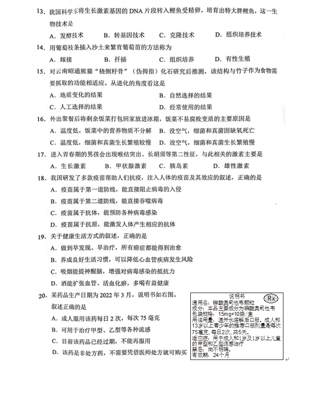 2023年重庆中考生物试卷真题及答案